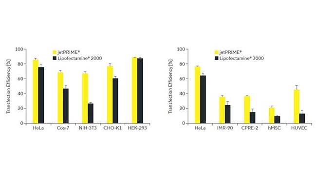 jetPRIME® is a simple transfection reagent for routine experiments that leads to efficient and reliable scientific results. It results in exceptionally high transfection rates in adherent cell lines of various origins, including primary cells.