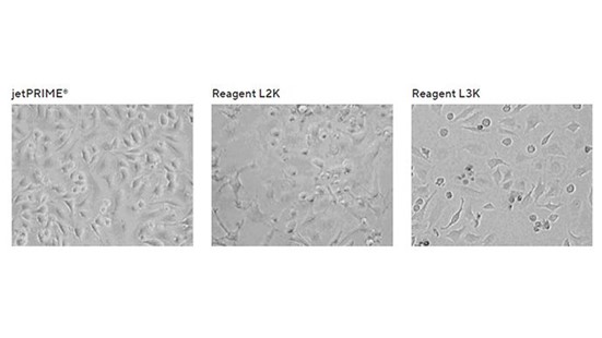 Transfection with jetPRIME® requires small amounts of reagent and nucleic acids, leading to increased cell viability while maintaining high transfection efficiency.