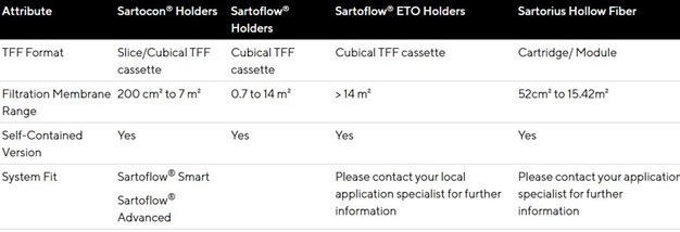 Kako bi se suprotstavilo silama potrebnim za pogon tangencijalne filtracije protoka (TFF), potreban je robusni držač kasete koji može olakšati protok tekućine u dovodnim, retentatnim i permeatnim vodovima. Sartorius nudi razne držače TFF-a koji odgovaraju različitim veličinama, protocima i membranskim površinama TFF kaseta, bilo da se radi o malim formatima (Sartocon® držači) ili velikim formatima (Sartoflow® držači).