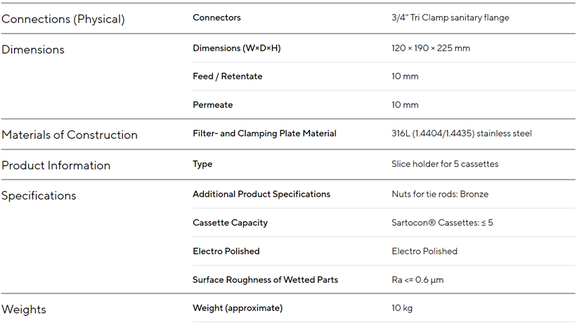 Sartocon® Slice držač dostupan je za maksimalno pet Sartocon® Slice kazeta (0,5m²) i zatvara jaz između malog Sartocon® Slice 200 držača (0,02 - 0,04m²) i Sartocon® 2 plus držača vage (do 7m²). Sartocon® Slice držač podržava aplikacije početnog volumena do 100 L. To ga zajedno s minimalnim radnim volumenom čini univerzalnim alatom za sve crossflow aplikacije u razvoju procesa i "small scale" proizvodnje. Gornji dio držača može se ukloniti za ugradnju kazete. Zamjena kazeta je jednostavna jer se između kazeta i steznih ploča ne smiju postavljati brtve. Držač je moguće termički sterilizirati u autoklavu ili parom, čak i s instaliranim kazetama. U tu svrhu potrebna je ugradnja alata za kompenzaciju tlaka. Hidrodinamički put protoka svih Sartocon® kazeta i korišteni materijali identični su u svim crossflow kazetama. Ovaj ujednačeni dizajn unutar obitelji Sartocon® uređaja, pruža korisniku predvidljive performanse u studijama skaliranja.