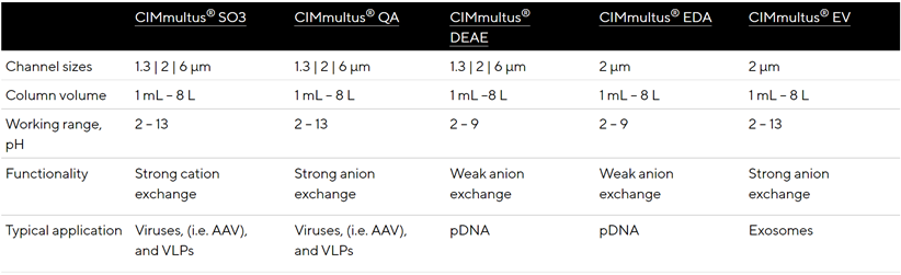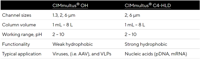 Iskoristite sve atribute monolitne kromatografije s nizom jakih i slabih anionskih i kationskih izmjenjivača kako biste zadovoljili potrebe pročišćavanja velikih biomolekula.