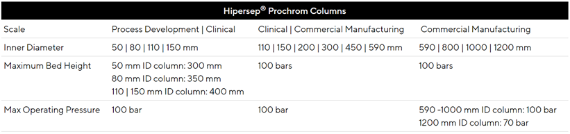 Hipersep® Prochrom HPLC kolone dizajnirane su za razvoj procesa i proizvodnju. Dostupne su od 50 mm do 1200 mm ID. Sličan dizajn u cijelom rasponu osigurava pravo linearno povećanje performansi kolone, pojednostavljujući povećanje bez potrebe za ponovnim razvojem metode.