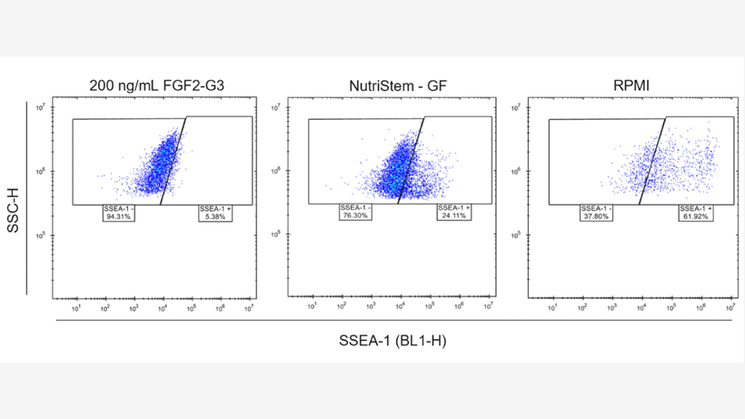 Točkasti dijagrami generirani u iQue Forecyt® softveru prikazuju razliku u ekspresiji SSEA-1 kod iPSC stanica suplementiranih Sartorius rekombinantnim FGF2-G3 proteinom.