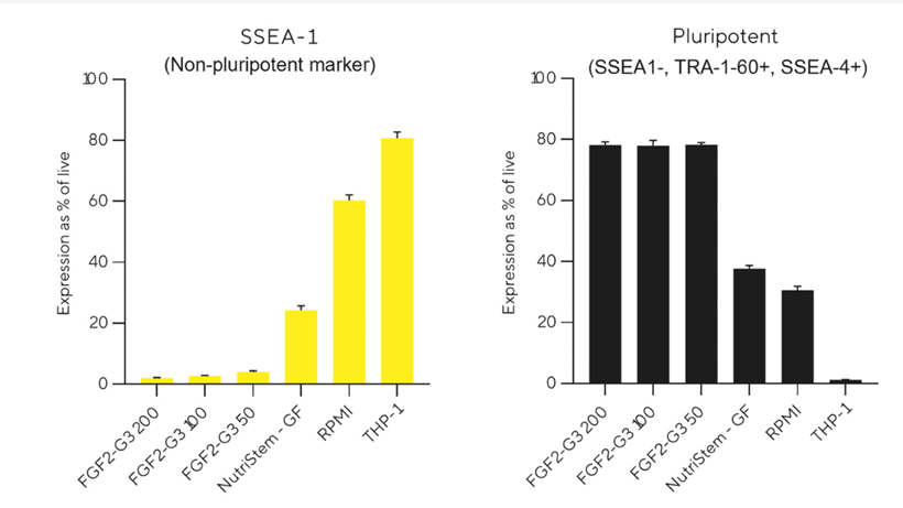Slike 1, 2 i 3: iPSC stanice uzgajane su bez zamjene medija tijekom 5 dana u različitim uvjetima koristeći NutriStem® hPSC XF Growth Factor (GF)-Free medij, uz dodatak Sartorius rekombinantnog TGF-β1 PLUS proteina (2 ng/mL) i FGF2-G3 proteina (50–200 ng/mL), termostabilne varijante FGF-2. Stupčasti dijagrami prikazuju ekspresiju markera nakon 5 dana uzgoja, analizirani na iQue® sustavu za ekspresiju SSEA-1 i održavanje pluripotentnog fenotipa.