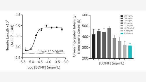 SH-SY5Y stanice razvile su zreo neuronski fenotip unutar 14 dana (HD faza i fluorescentne slike), a kvantifikacija je pokazala da BDNF inducira učinak ovisan o koncentraciji na izrastanje neurita i ekspresiju CD56 u usporedbi s kontrolom (medij bez seruma).
