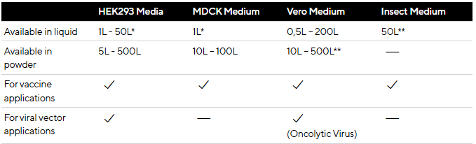 Sartorius nudi kompletan portfelj medija i hrane za proizvodnju virusnih cjepiva ili virusnih vektora za cjepiva, gensku terapiju i primjenu u staničnoj terapiji s modificiranim genima. Sartoriusovi specijalizirani mediji za podršku virusnim terapijama su kemijski definirana bez seruma i bez životinjskih sastojaka, a primjenjuju se za: