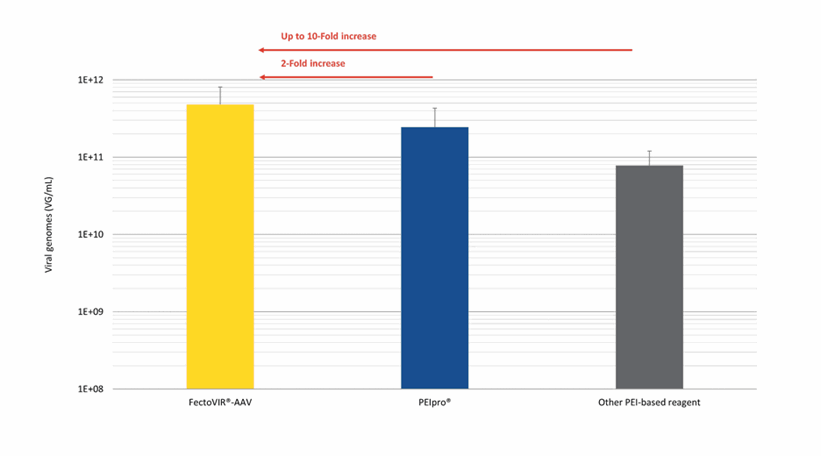 Vrijednost titra je ključno mjerilo za procjenu smanjenja troškova, stoga izbor transfekcijskog reagensa izravno utječe na troškove proizvodnje. U usporedbi sa zlatnim standardom poput PEIpro® i drugim konkurentskim transfekcijskim reagensima, FectoVIR® -AAV se ističe neusporedivim performansama u proizvodnji najviših prinosa rAAV-a u suspenzijskim sustavima stanične kulture. U usporedbi s konkurentima, FectoVIR® -AAV poboljšava prinos proizvodnje AAV-a s do 10 puta većih titara virusnog genoma.