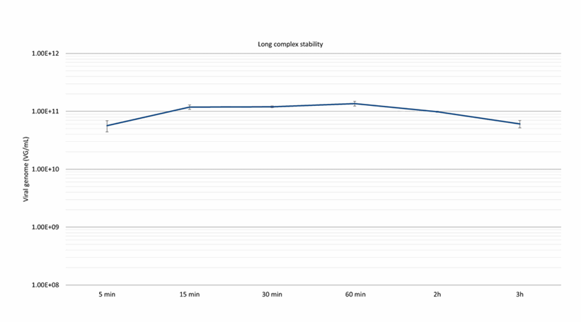 Tranzijentna transfekcija velikih razmjera zahtijeva dodavanje većeg volumena transfekcijskih kompleksa u suspenzijsku staničnu kulturu, što znači dulje vrijeme prijenosa. S FectoVIR® -AAV, vrijeme prijenosa više nije ograničavajući faktor koji može dovesti do varijabilnosti prinosa virusnog titra. Transfekcijski kompleksi FectoVIR® -AAV pokazuju iznimnu stabilnost: nakon miješanja transfekcijskog reagensa FectoVIR® -AAV i plazmidne DNA, transfekcijski kompleksi mogu se pouzdano dodati stanicama unutar 3 sata bez značajnih varijacija u prinosu titra rAAV.