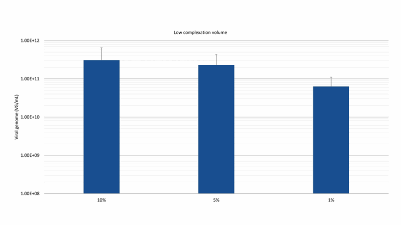 Skalabilnost je ključna za razvoj visokoprinosnog i pouzdanog procesa proizvodnje rAAV virusnog vektora za komercijalizaciju. Tranzijentna transfekcija velikih razmjera podrazumijeva da se veliki volumeni transfekcijskih kompleksa moraju pripremiti i dodati u suspenzijske stanice unutar zadanog vremenskog okvira kako bi transfekcija bila učinkovita. FectoVIR® -AAV rješava ograničenje volumena. FectoVIR® -AAV je optimiziran za smanjenje volumena kompleksacije na 1%, olakšavajući pripremu transfekcijskih kompleksa za proizvodnju velikih razmjera. Na primjer, za volumen suspenzije stanica od 2000 L, volumen transfekcijske kompleksacije može se optimizirati s 200 L (10%) na 20 L (1%).