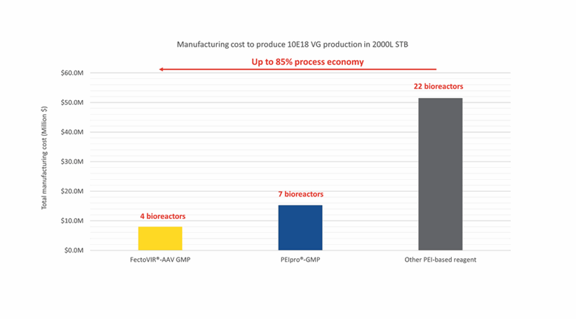 FectoVIR® -AAV omogućuje intenziviranje procesa povećanjem produktivnosti. Proizvodnjom više rAAV čestica postiže se veći broj doza za isti volumen serije, što znači smanjenje troškova po dozi (manje rada i sirovina) i smanjenje zauzete površine (manji broj bioreaktora ili manji bioreaktori za niže kapitalne troškove) kako bi se izravno smanjio ukupan trošak proizvodnje.