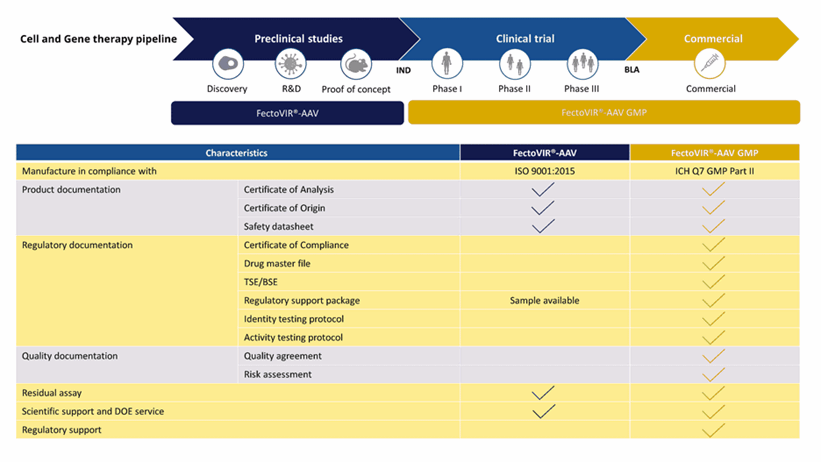 FectoVIR® -AAV GMP proizvodi se u dvostupanjskom procesu u skladu s ICH Q7 GMP Part II (Eudralex Vol 4, Part II), osiguravajući validirani i aseptični proizvodni proces za maksimiziranje kvalitete transfekcijskog reagensa. Vrećica FectoVIR® -AAV od 1 L omogućuje rad u zatvorenom sustavu s MPC priključkom i c-flex cijevi kako bi se smanjio rizik od kontaminacije. S ciljem osiguranja sljedivosti i kvalitete proizvoda, uz FectoVIR® -AAV dostavljaju se i dodatni regulatorni podnesci (IND i BLA), uz cijeli set dokumentacije. Također je dostupan i test reziduala za analizu prisutnosti/odsutnosti transfekcijskog reagensa u lijeku.