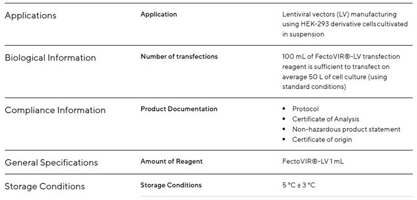 Lentivirusni vektori prepoznati su kao nosač izbora za alogene ili autologne stanične terapije (poput CAR-T) zbog svoje sposobnosti trajne integracije virusnog genoma u DNK stanice domaćina. Za proizvodnju tih vektora, proizvođači stanične terapije općenito koriste sustav prolazne transfekcije koji se povećava tijekom faza razvoja procesa. FectoVIR®-LV je napravljen za proizvodnju velikih razmjera sa smanjenjem volumena kompleksacije i povećanom stabilnošću kompleksa. Prednosti FectoVIR®-LV omogućuju povećanje broja proizvedenih doza po seriji za liječenje više pacijenata, uz smanjenje troškova proizvodnje LV.