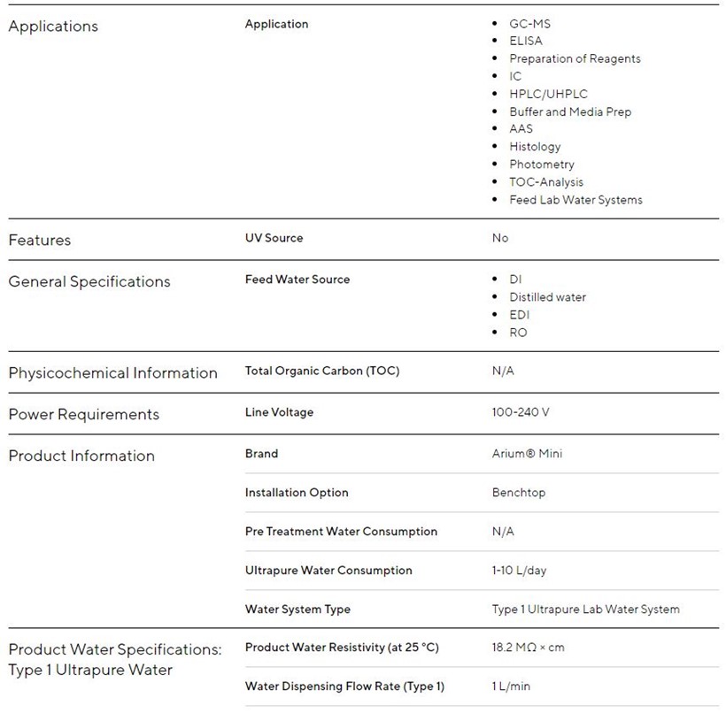 Arium® Mini Extend nalazi primjenu u područjima biokemijske i molekularno-biološke analize, tkivnom inžinjerstvu, kozmetičkoj i farmaceutskoj industriji (GC-MS, ELISA, priprema reagensa, IC, HPLC/UHPLC, priprema reagensa i medija, AAS, histologija, fotometrija, TOC-analiza).