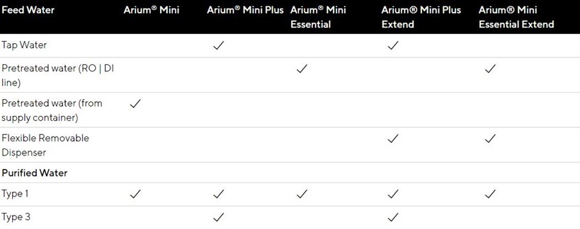 Dostupni modeli uključuju Arium® Mini Plus Extend za pročišćavanje pitke vode iz slavine i Arium® Mini Essential Extend za pročišćavanje prethodno tretirane vode. Odaberite sustav sa UV-lampom na temelju zahtjeva aplikacije i postizanje razine TOC-a ≤5 ppb.