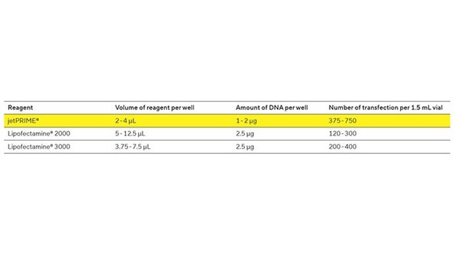 Transfekcija z jetPRIME® zahteva majhne količine reagenta in DNA/siRNA, kar naredi uporabo zelo ekonomično.