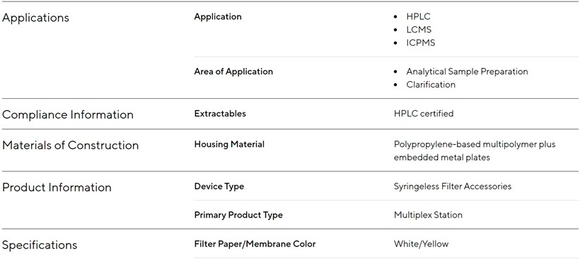 Koristi se za tretiranje Claristep® filtracijskih jedinica bez upotrebe štrcaljke. Platforma je zamjenjiva i prikladna za pozicioniranje boca za uzorke i filtracijskih jedinica koje se mogu posebno naručiti.