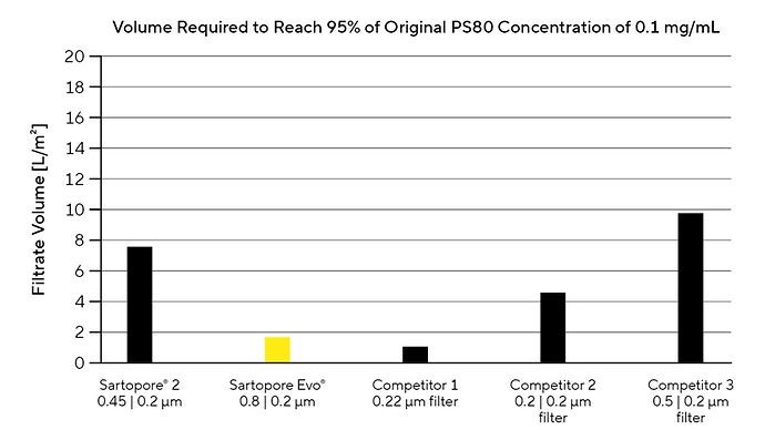 PES membranski filtri Sartopore Evo® kažejo nižjo adsorpcijo polisorbata kot PVDF membranski filtri in bistveno nižjo adsorpcijo kot drugi PES membranski filtri. Posledično filtri Sartopore Evo® hitro obnovijo začetno koncentracijo polisorbata v filtrirani formulaciji, kar zmanjšuje morebitno izgubo izdelka med postopkom polnjenja.