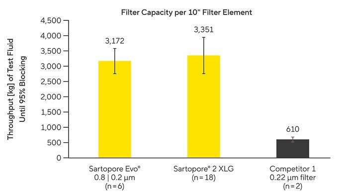 S kombinacijo asimetrične predfiltrske membrane 0,8 µm s končnim filtrskim slojem 0,2 µm filtri Sartopore Evo® dosegajo visoko kapaciteto filtracije, primerljivo s filtri Sartopore® 2 XLG, in bistveno višjo od PVDF membranskih filtrov. To je bilo potrjeno z uporabo modelne raztopine z visokim zamašitvenim potencialom in potrjeno z rezultati testiranj z drugimi tekočinami, kot je 5,0% IVIG.