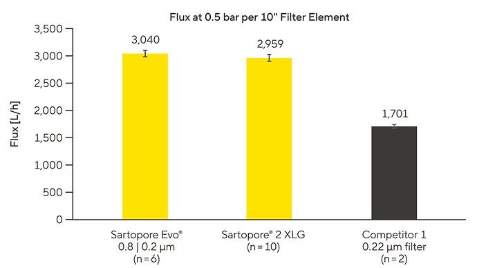 Filtri Sartopore Evo® dosegajo višje hitrosti pretoka vode v primerjavi s filtri Sartopore® 2 XLG in bistveno višje hitrosti pretoka od PVDF filtrov, ki se pogosto uporabljajo za končno filtracijo.